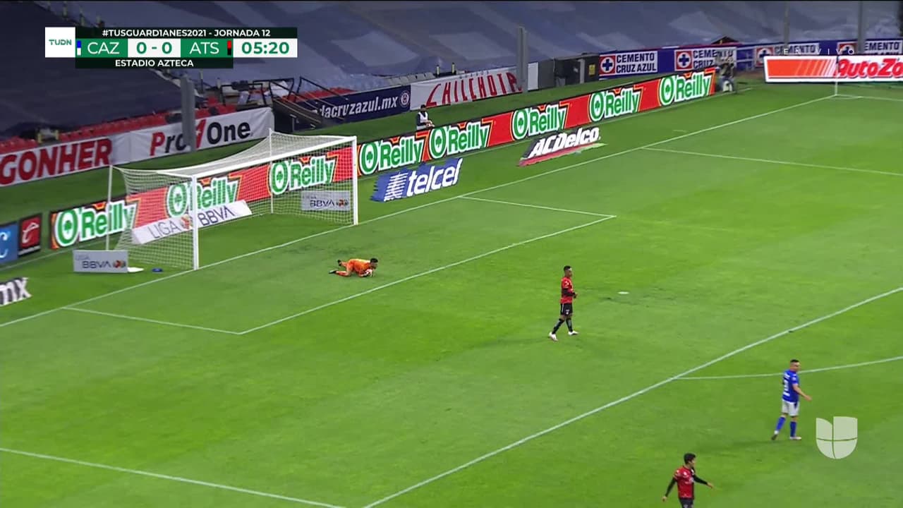 Tiro atajado por abajo a la izquierda. Bryan Angulo (Cruz Azul) zurdazo desde fuera del área.