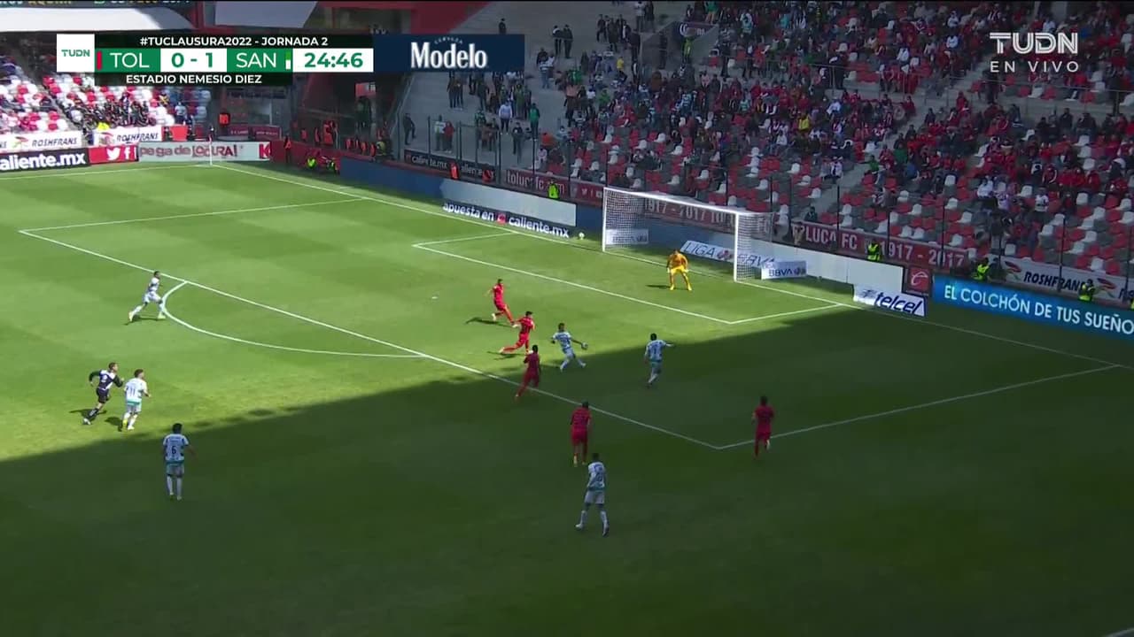 Tiro atajado raso al centro del arco. Brian Lozano (Santos Laguna) Disparo con la derecha desde el centro del área. Asistencia de Juan Ferney Otero.