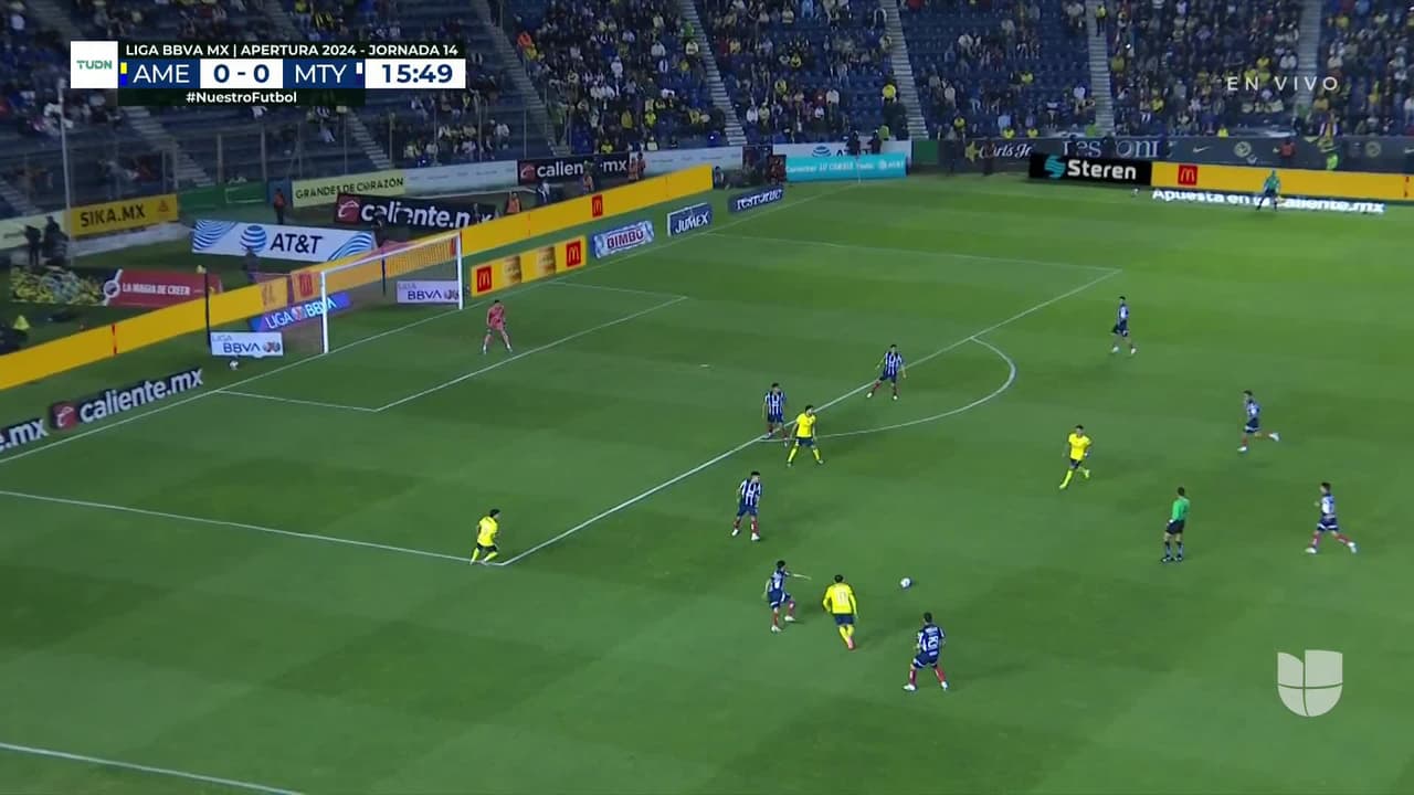 Tiro atajado. Brian Rodríguez (América) zurdazo desde el lado izquierdo dentro del área.