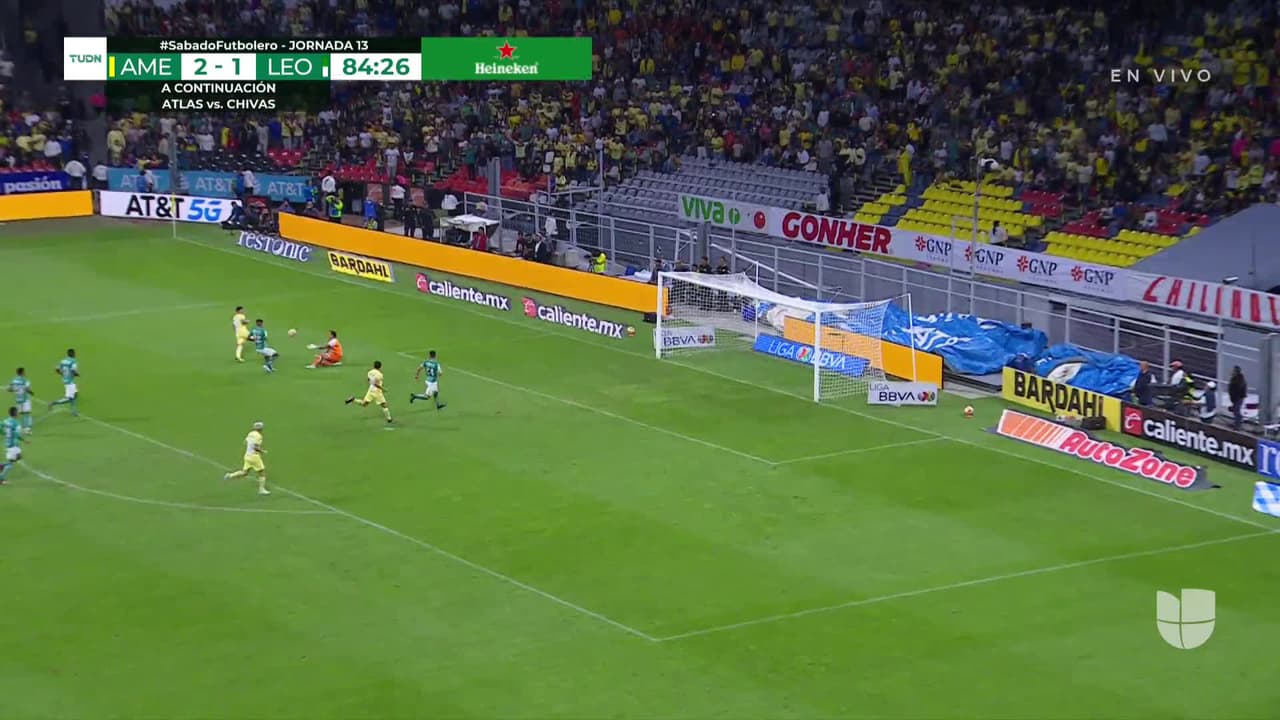 Tiro atajado. Brian Rodríguez (América) zurdazo desde el lado izquierdo dentro del área.