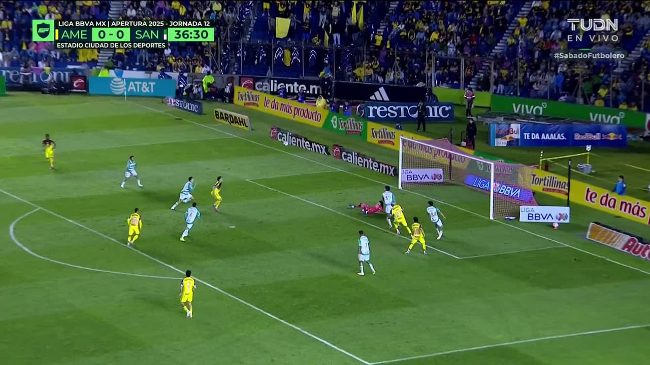 Tiro atajado raso al centro del arco. Brian Rodríguez (América) Disparo con la derecha desde fuera del área. Asistencia de Alexis Gutiérrez.