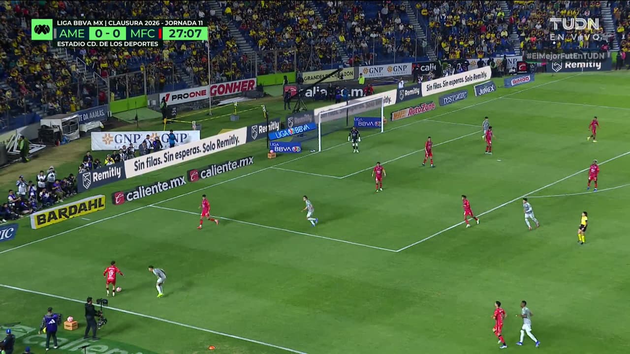 Tiro atajado raso al centro del arco. Brian Rodríguez (América) zurdazo desde el lado izquierdo dentro del área. Asistencia de Patricio Salas.