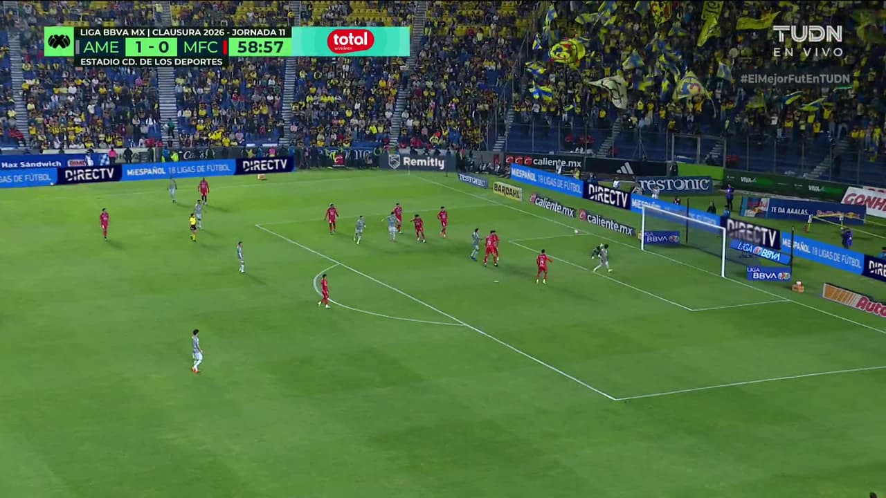 Tiro atajado raso al centro del arco. Brian Rodríguez (América) zurdazo desde el lado izquierdo dentro del área. Asistencia de Raphael Veiga.
