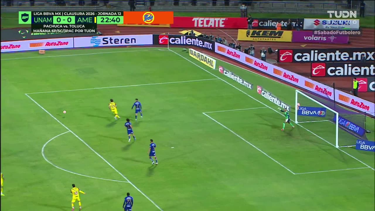 Tiro atajado. Brian Rodríguez (América) Disparo con la derecha desde más de 30 metros.