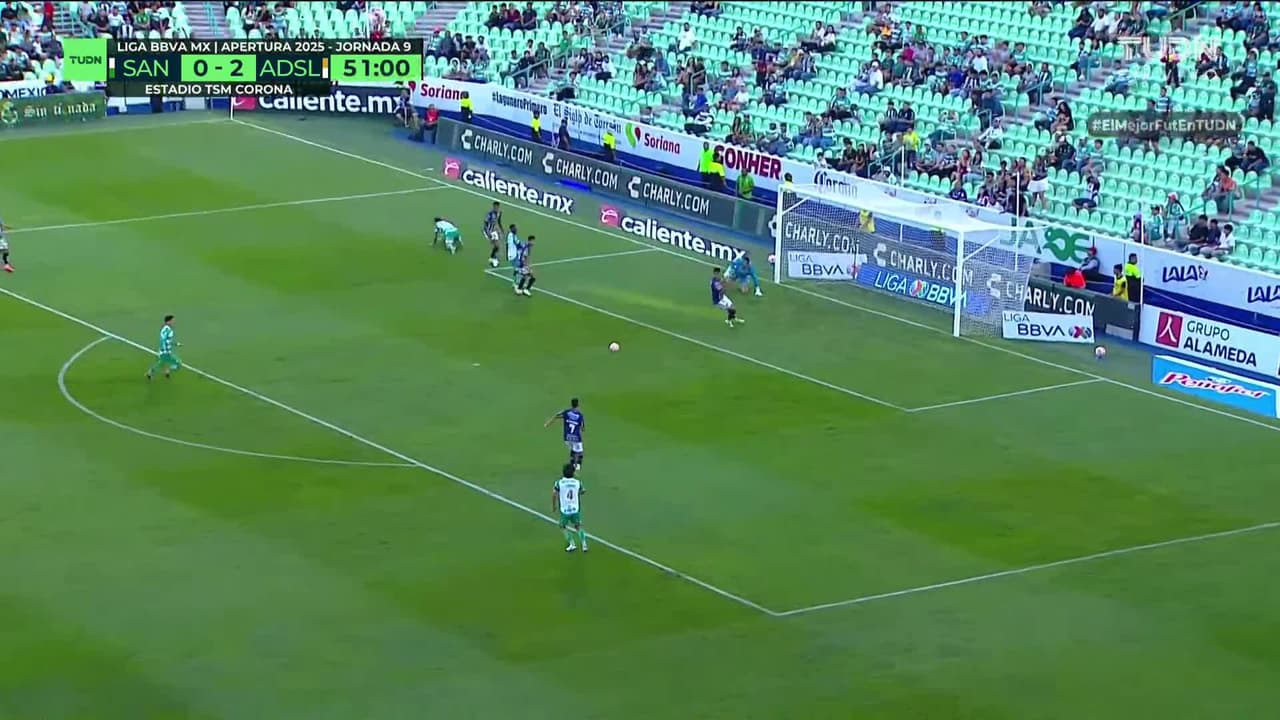 Tiro atajado raso al centro del arco. Bruno Barticciotto (Santos Laguna) Disparo con la derecha desde el lado izquierdo dentro del área. Asistencia de Cristian Dájome.