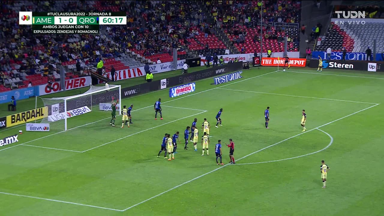 Tiro atajado Por arriba en el centro del arco. Bruno Valdez (América) disparo de cabeza desde el centro del área.