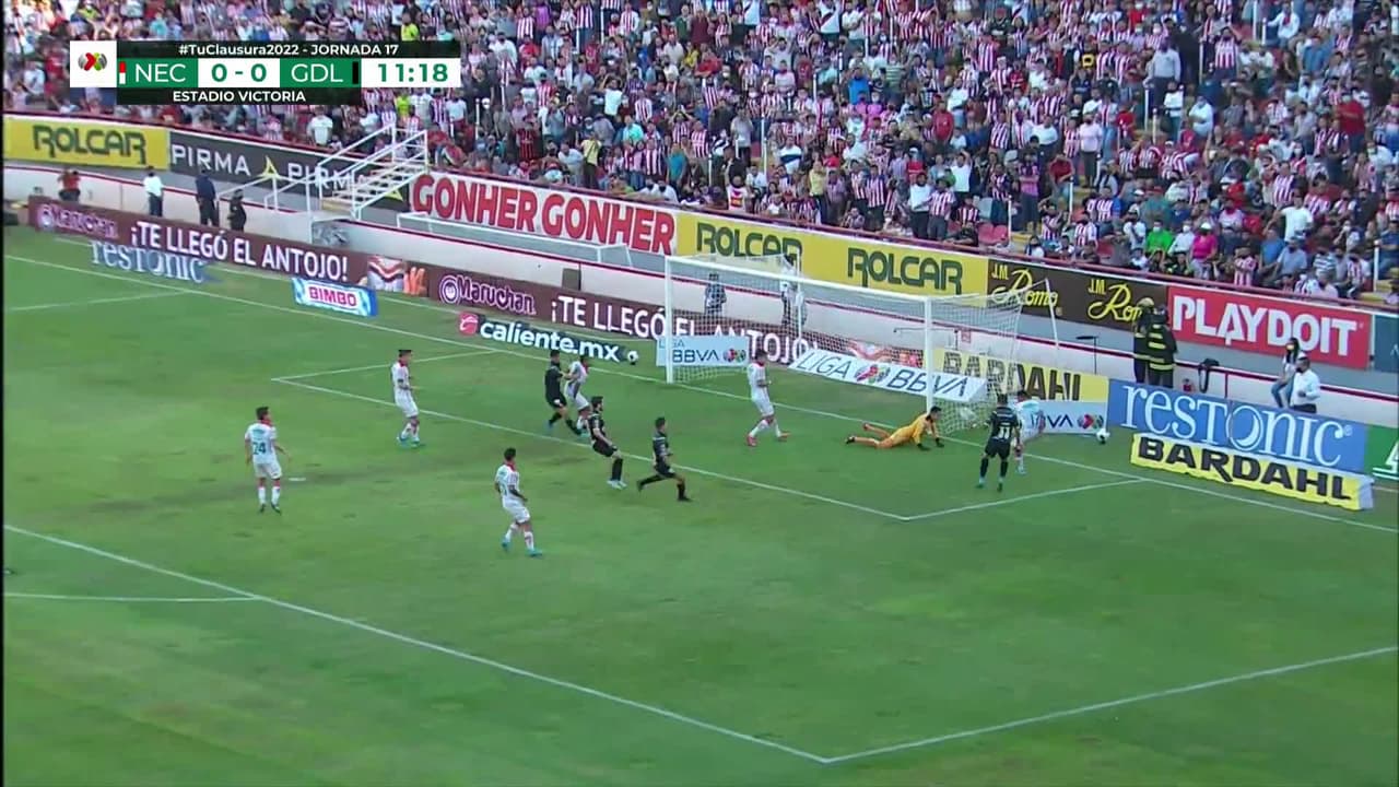 Tiro atajado junto al lado derecho de la portería. Carlos Cisneros (Chivas ) Disparo con la derecha desde el lado derecho dentro del área. Asistencia de Alexis Vega.