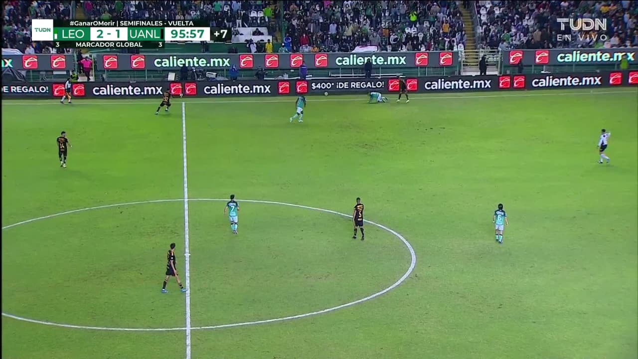 Tiro atajado raso al centro del arco. Carlos González (Tigres) disparo de cabeza desde el centro del área. Asistencia de Carlos Salcedo con un pase de cabeza.