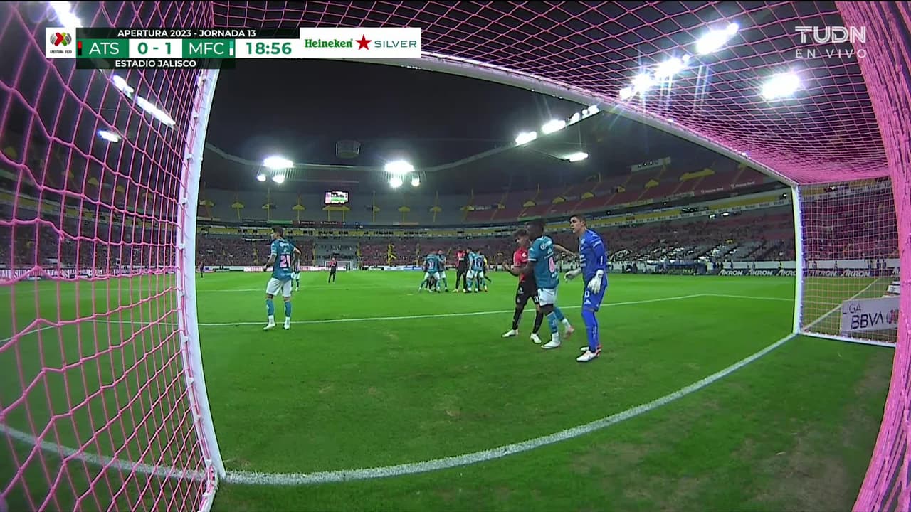 Tiro atajado raso al centro del arco. Carlos Robles (Atlas) disparo de cabeza desde el centro del área. Asistencia de Juan Zapata con un centro al área.
