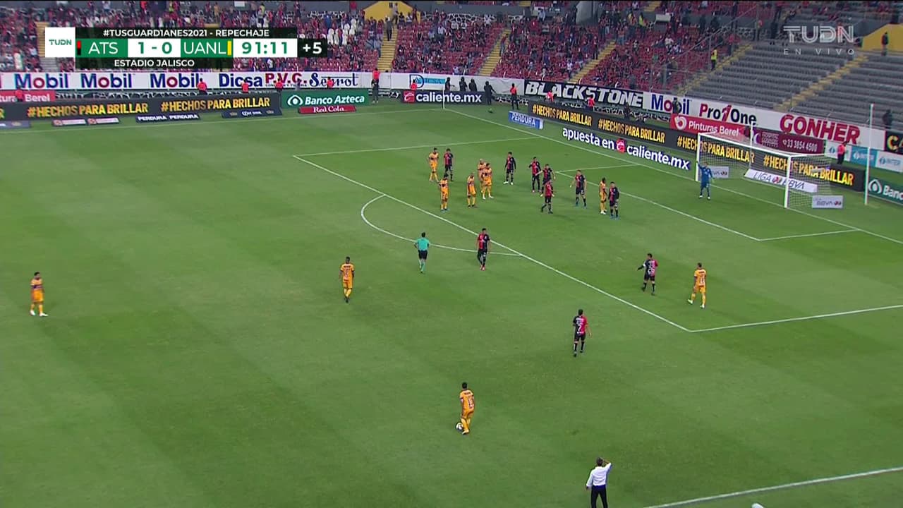 Tiro atajado raso al centro del arco. Carlos Salcedo (Tigres) disparo de cabeza a quemarropa desde el lado izquierdo. Asistencia de Leonardo Fernández con un centro al área.