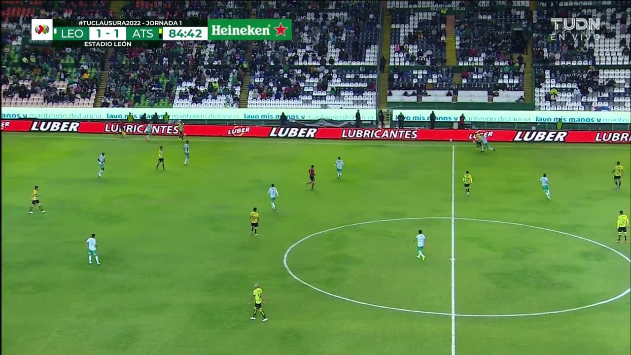 Tiro atajado. Christopher Trejo (Atlas) Disparo con la derecha desde el lado izquierdo dentro del área.
