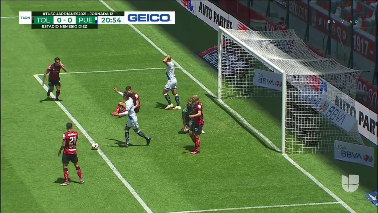 Tiro atajado. Claudio Baeza (Toluca) zurdazo desde el lado derecho dentro del área.