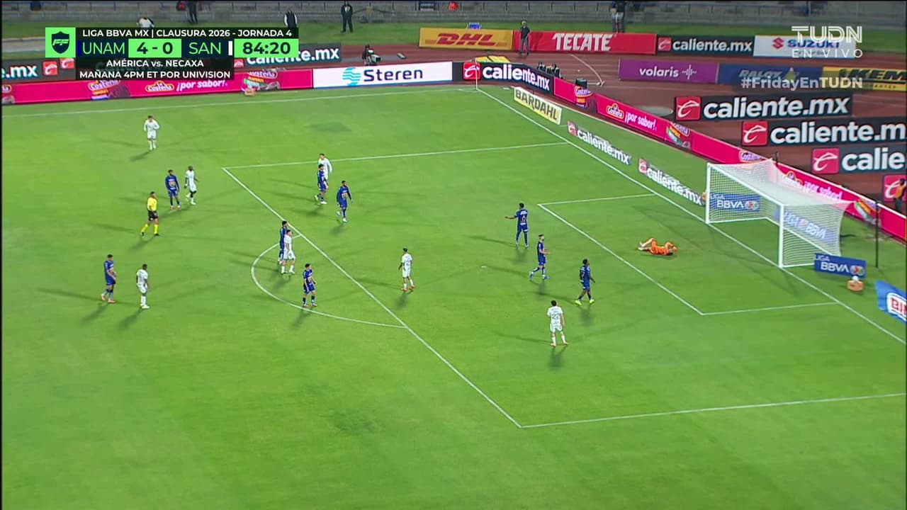 Tiro atajado al ángulo superior derecho. Cristian Dájome (Santos Laguna) Disparo con la derecha desde fuera del área. Asistencia de Emmanuel Echeverría.