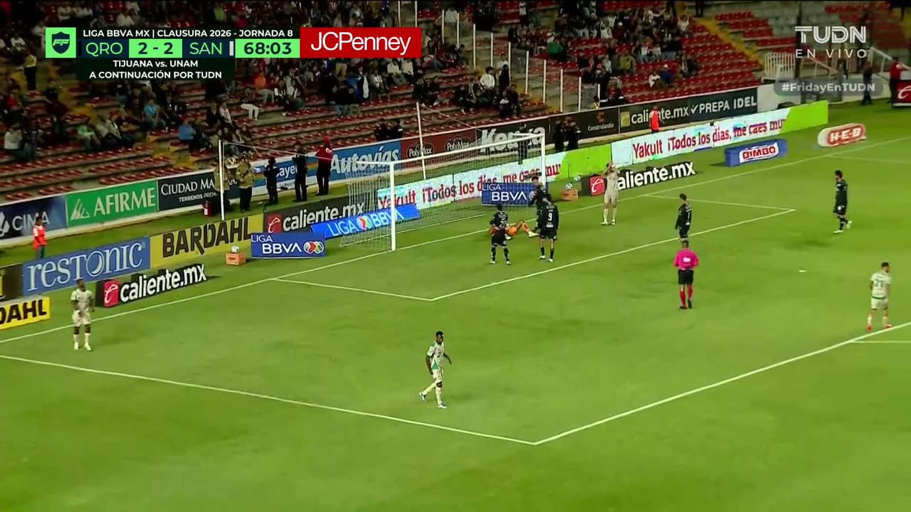 Tiro atajado junto al lado derecho de la portería. Cristian Dájome (Santos Laguna) zurdazo desde el centro del área. Asistencia de Kevin Palacios.