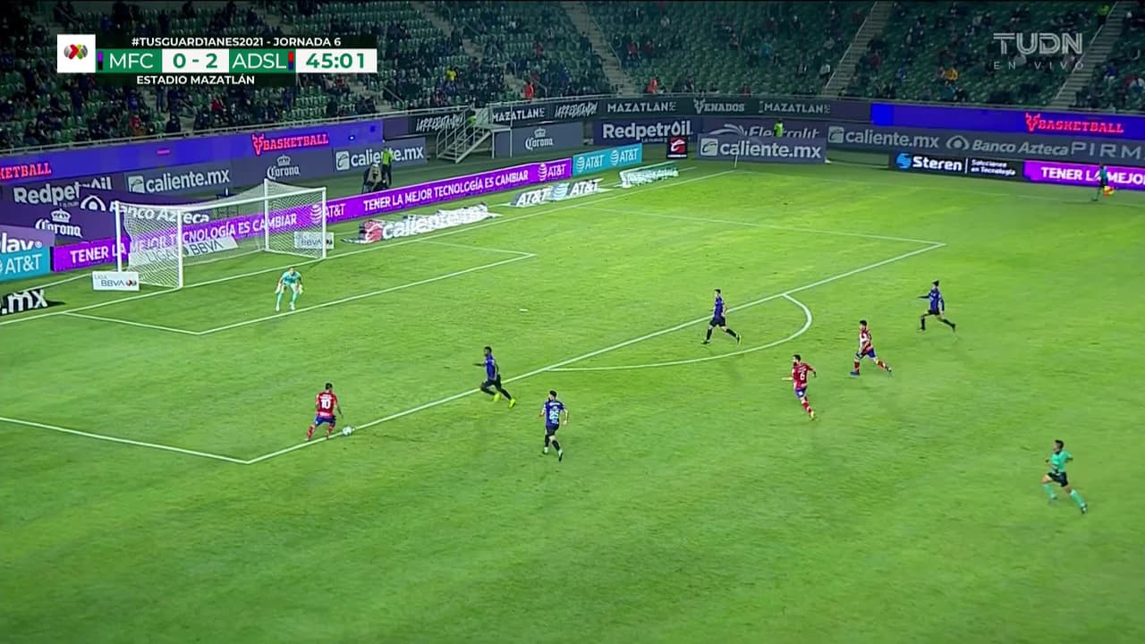 Tiro atajado al ángulo superior derecho. Damián Batallini (Atlético San Luis) Disparo con la derecha desde fuera del área. Asistencia de Luis Felipe Gallegos.