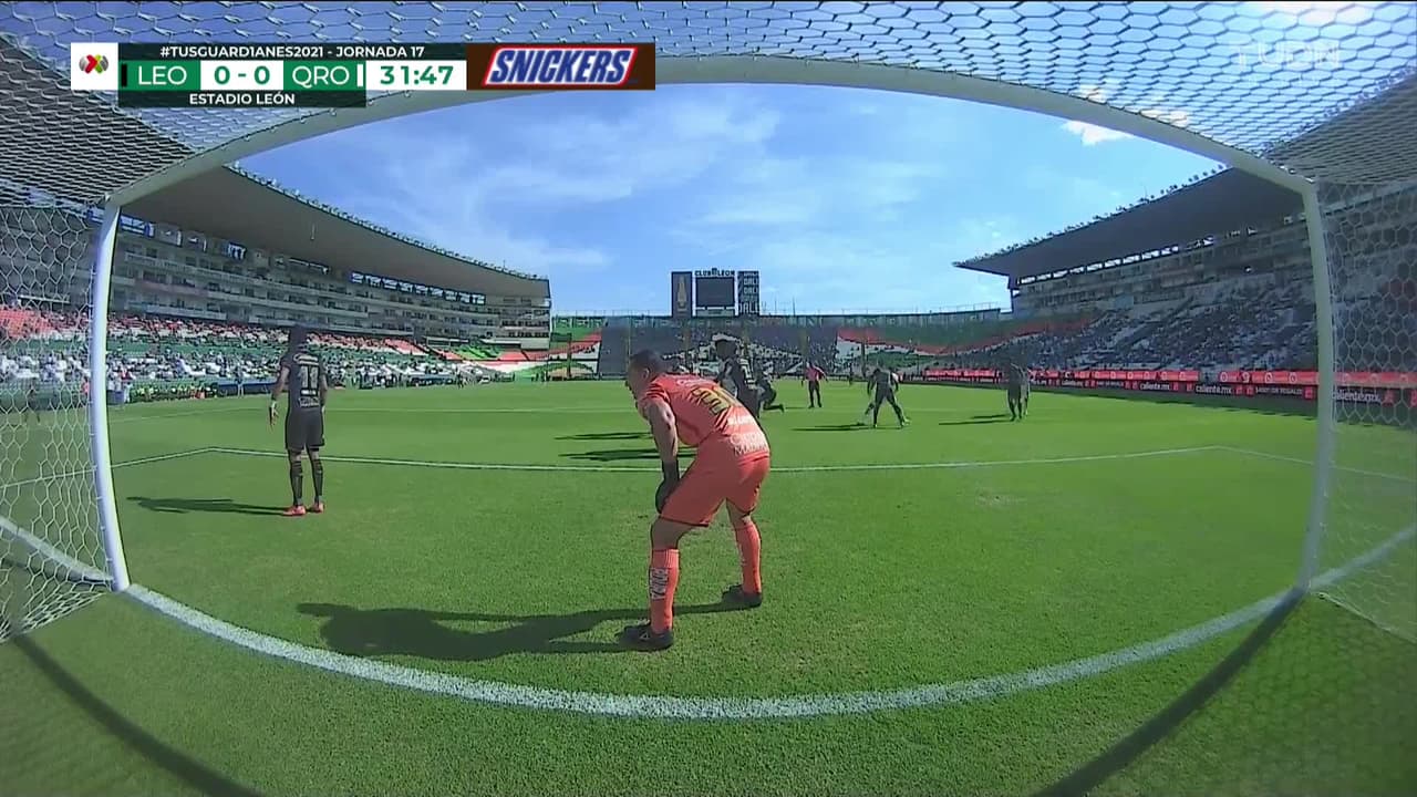 Tiro atajado. Daniel Cervantes (Querétaro) disparo de cabeza desde el centro del área.