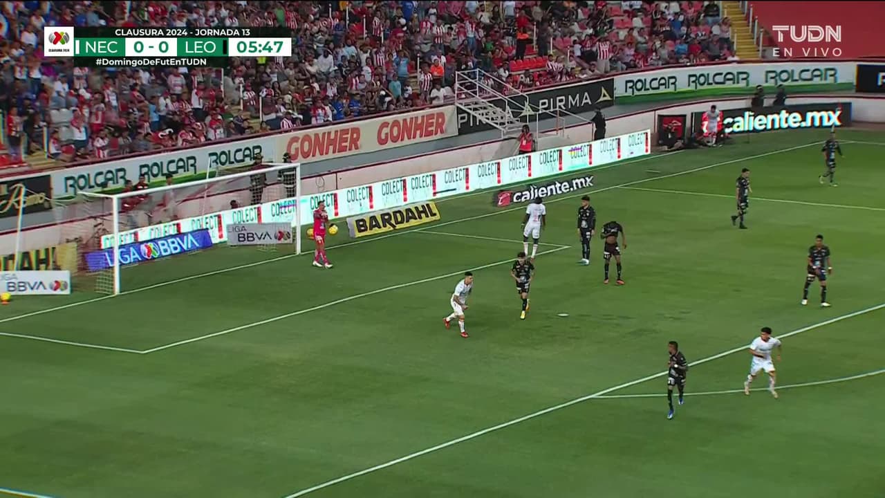 Tiro atajado. Díber Cambindo (Necaxa) disparo de cabeza desde el centro del área.