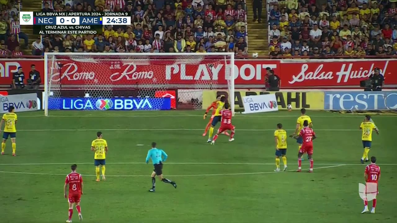 Tiro atajado. Diber Cambindo (Necaxa) zurdazo desde fuera del área.