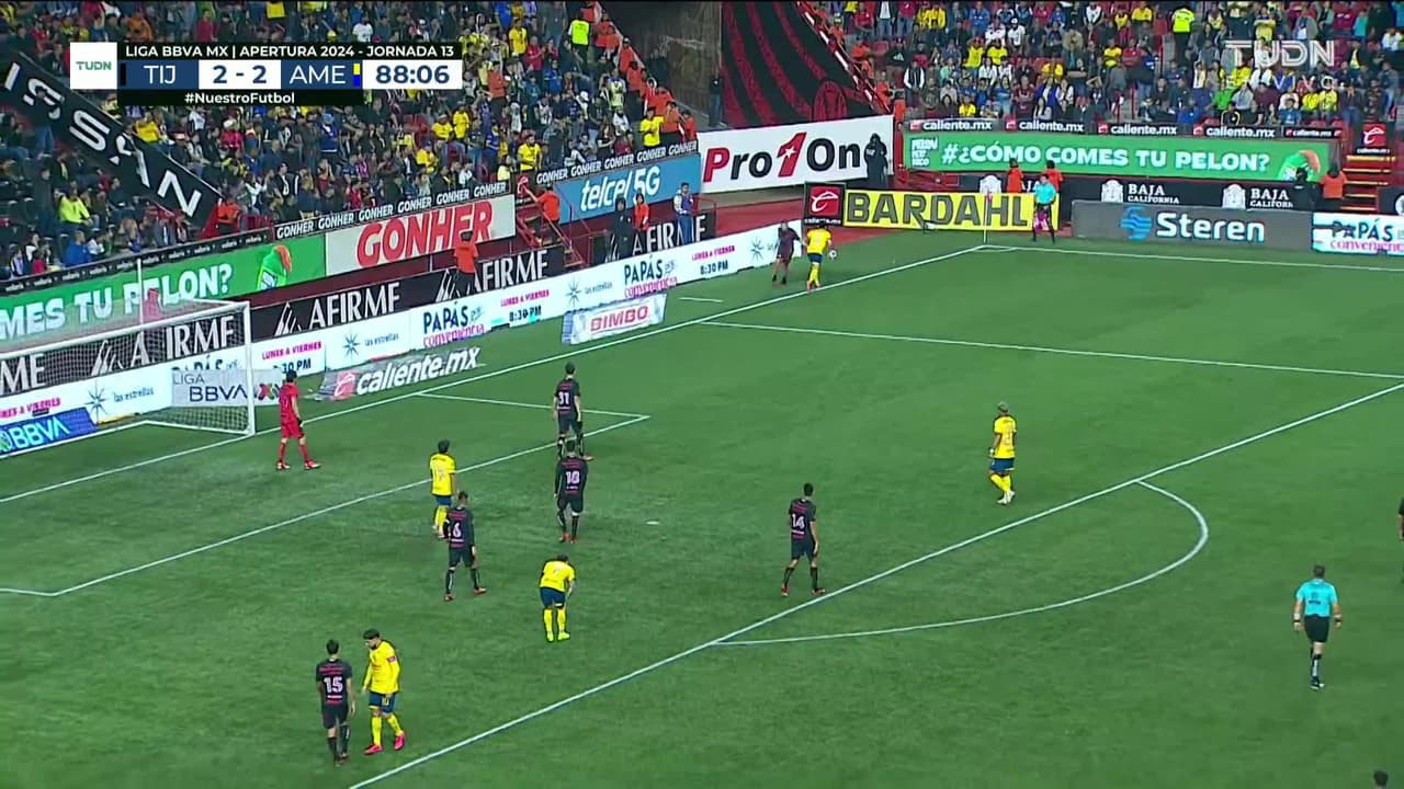 Tiro atajado junto al lado derecho de la portería. Diego Valdés (América) Disparo con la derecha desde fuera del área. Asistencia de Cristián Borja.