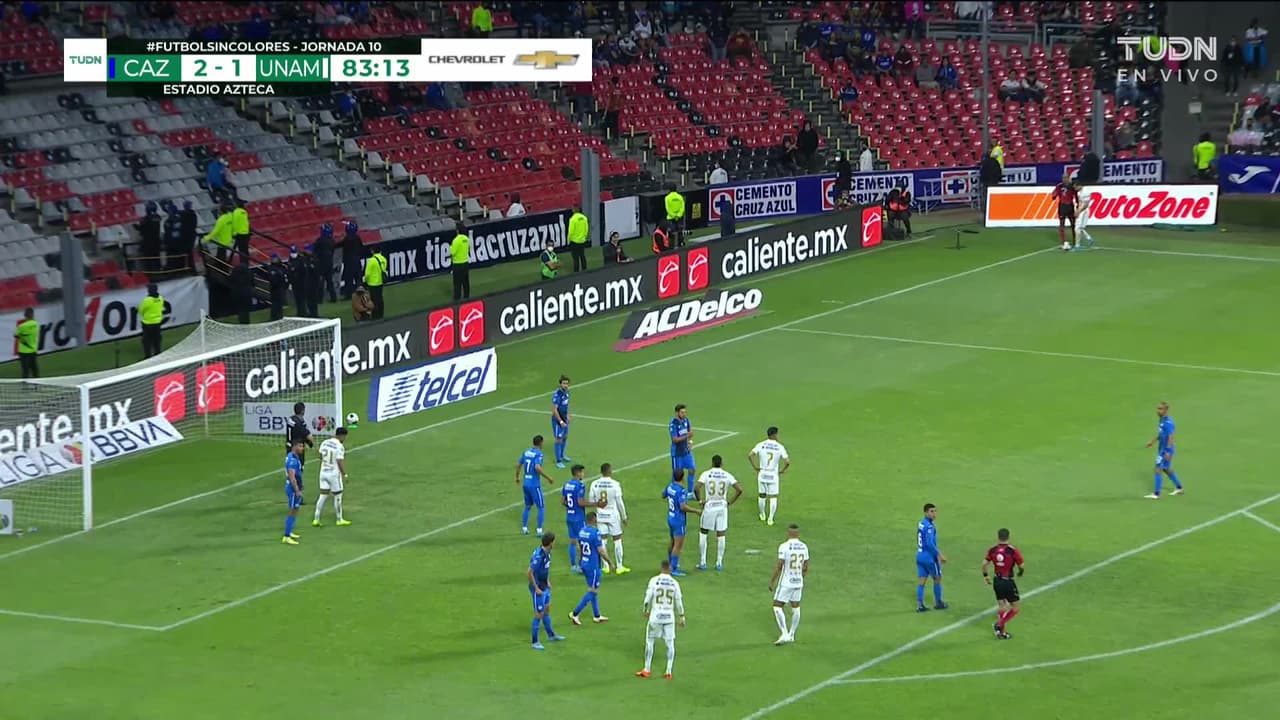 Tiro atajado raso al centro del arco. Diogo (Pumas UNAM) disparo de cabeza desde el centro del área. Asistencia de Alan Mozo con un centro al área.