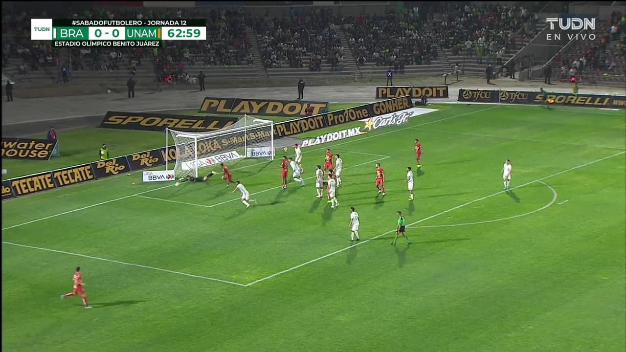 Tiro atajado por abajo a la izquierda. Diogo (Pumas UNAM) disparo de cabeza desde el centro del área.