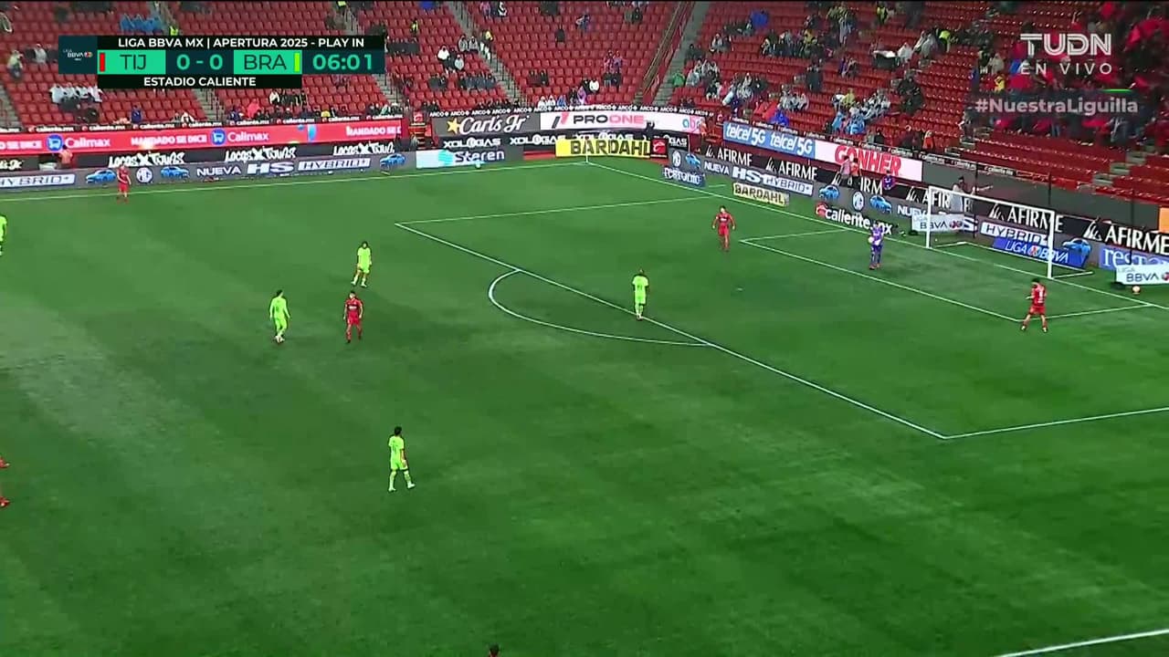 Tiro atajado. Domingo Blanco (Club Tijuana) Disparo con la derecha desde el lado izquierdo dentro del área.