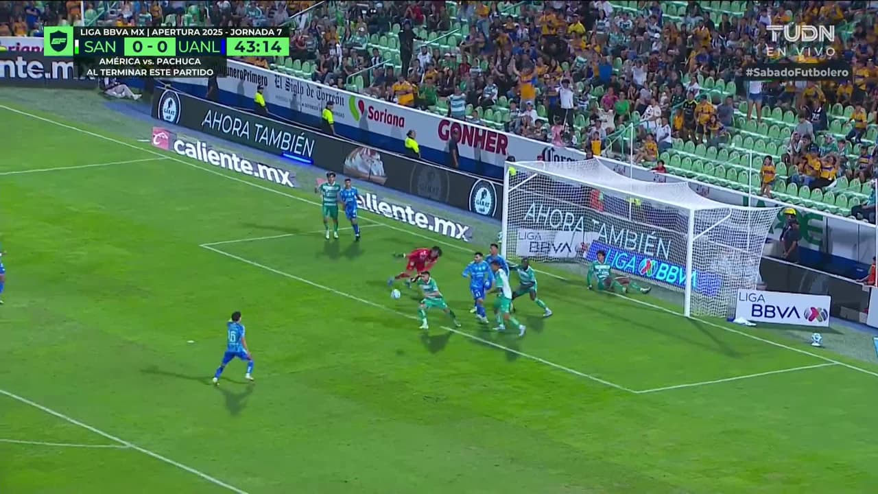 Tiro atajado raso al centro del arco. Édgar López (Tigres) zurdazo desde muy cerca.