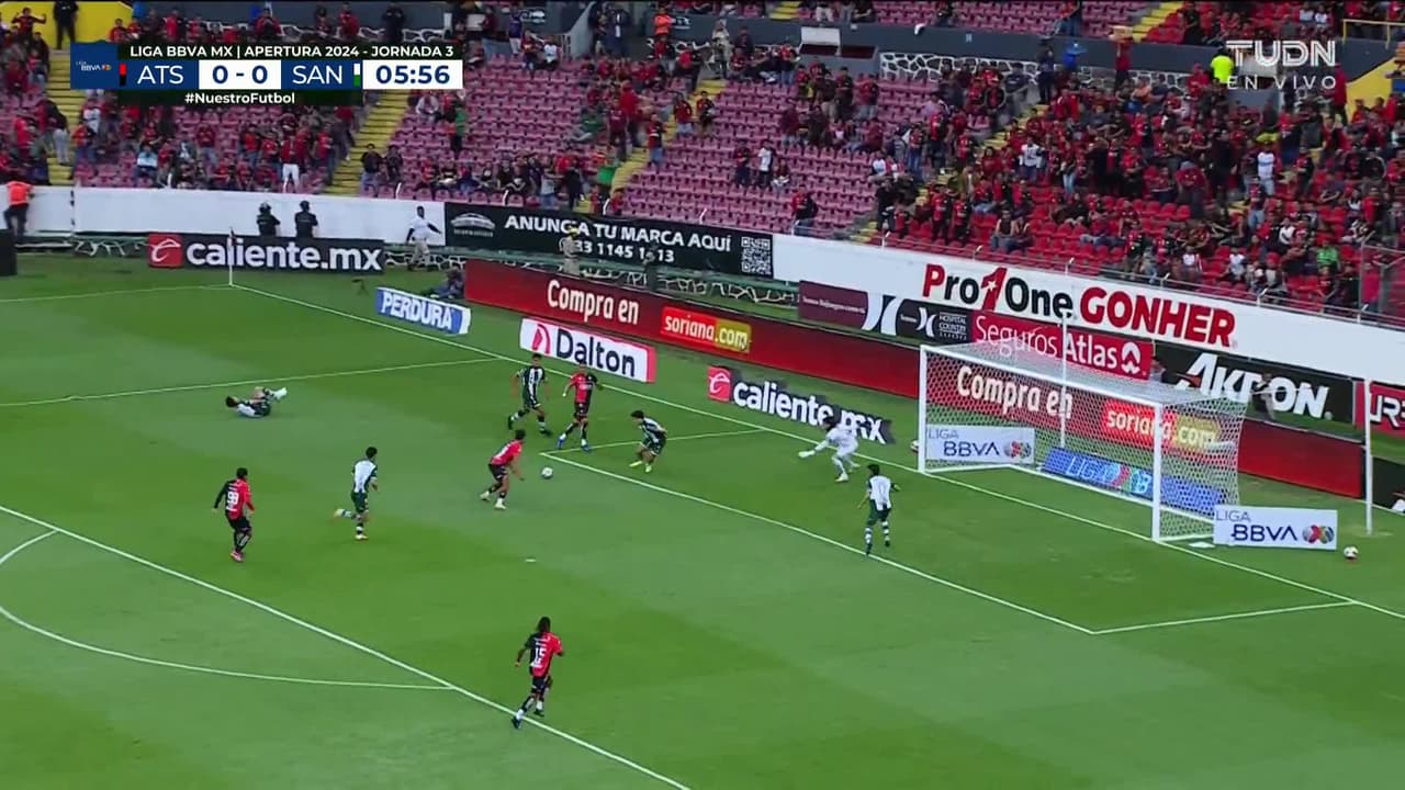 Tiro atajado. Eduardo Aguirre (Atlas) Disparo con la derecha desde el centro del área.