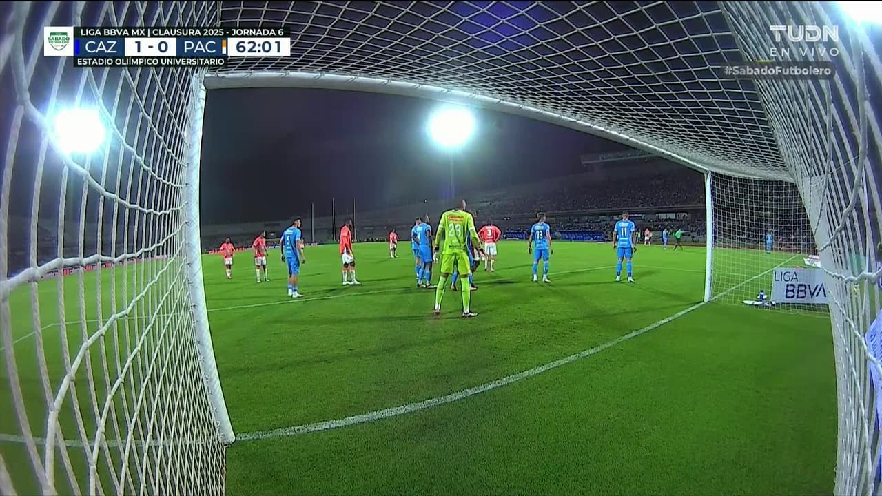 Tiro atajado Por arriba en el centro del arco. Eduardo Bauermann (Pachuca) disparo de cabeza desde el centro del área. Asistencia de Arturo González.