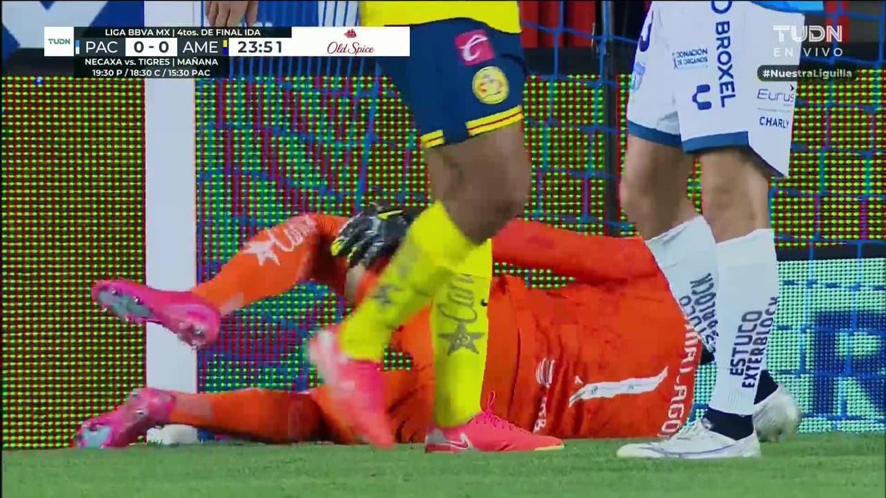 Tiro atajado por abajo a la izquierda. Eduardo Bauermann (Pachuca) disparo de cabeza desde el centro del área. Asistencia de Elías Montiel con un centro al área.