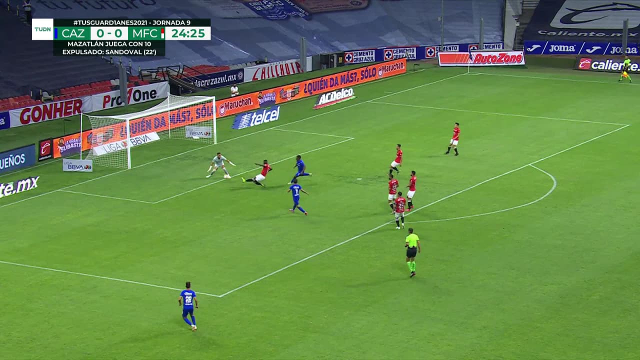 Tiro atajado raso al centro del arco. Elías Hernández (Cruz Azul) Disparo con la derecha desde fuera del área. Asistencia de Bryan Angulo.