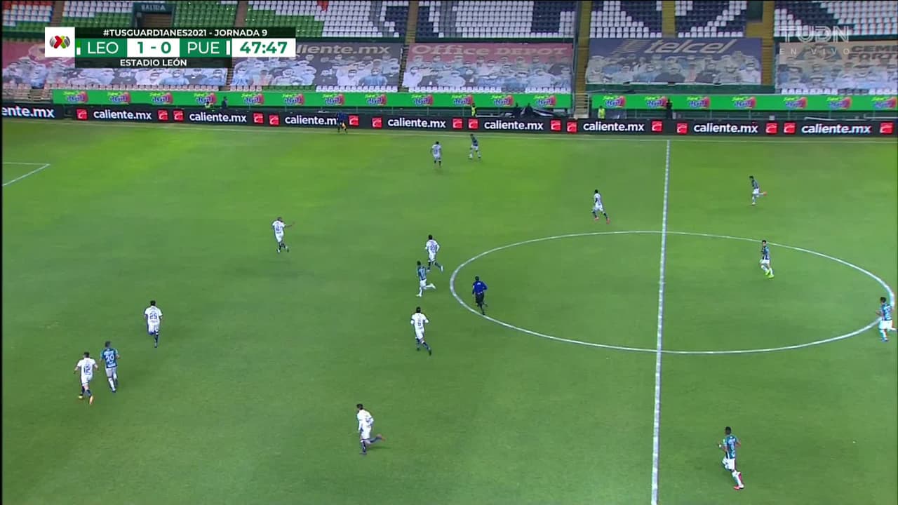 Tiro atajado junto al lado derecho de la portería. Emanuel Gigliotti (León) Disparo con la derecha desde el centro del área.