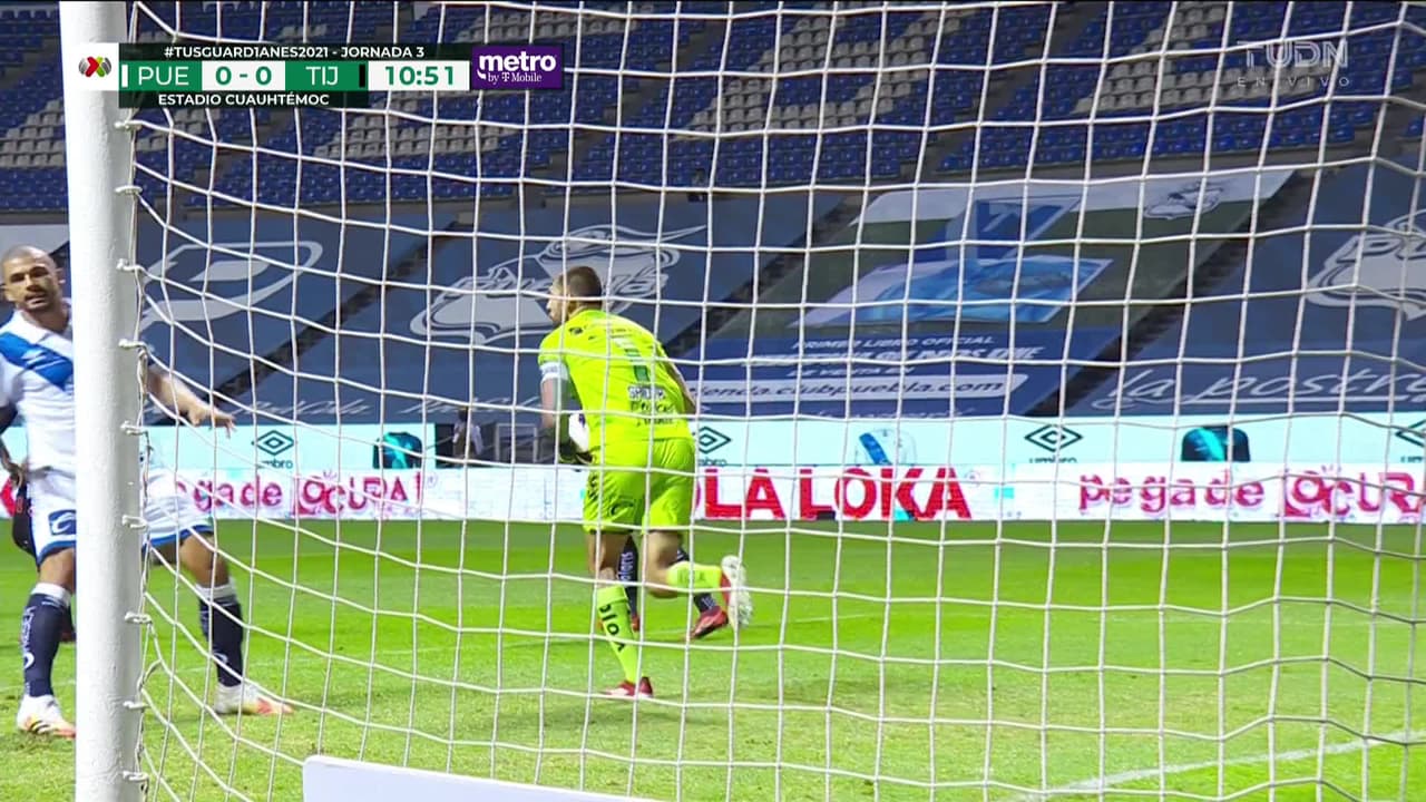 Tiro atajado raso al centro del arco. Emanuel Gularte (Puebla) disparo de cabeza desde el centro del área. Asistencia de George Corral con un centro al área.