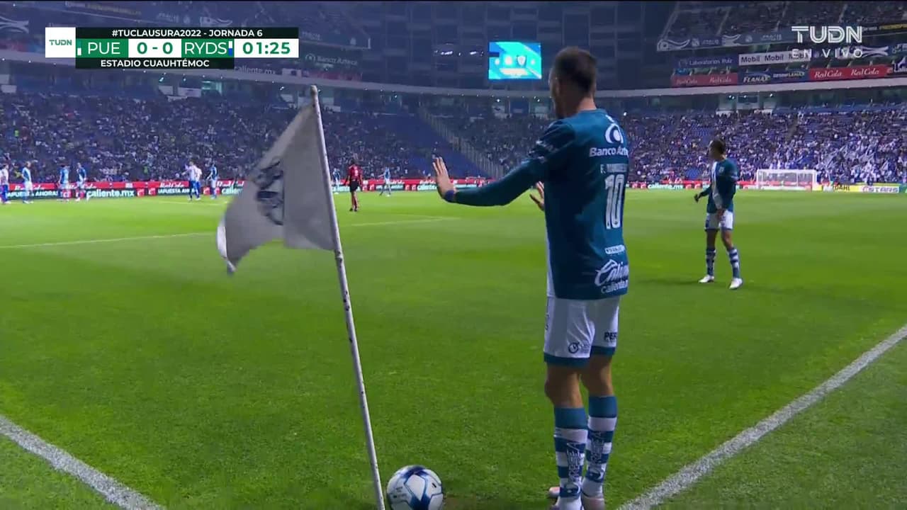 Tiro atajado por abajo a la izquierda. Emanuel Gularte (Puebla) disparo de cabeza desde el centro del área.