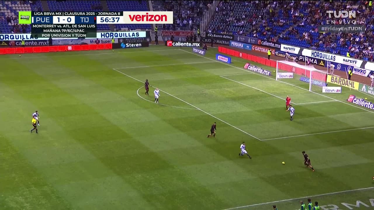 Tiro atajado al ángulo superior derecho. Emiliano Gómez (Puebla) zurdazo desde fuera del área. Asistencia de Brayan Angulo.