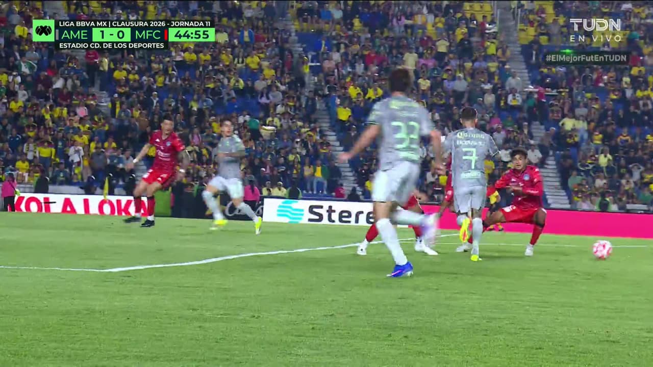 Tiro atajado. Érick Sánchez (América) Disparo con la derecha desde fuera del área.