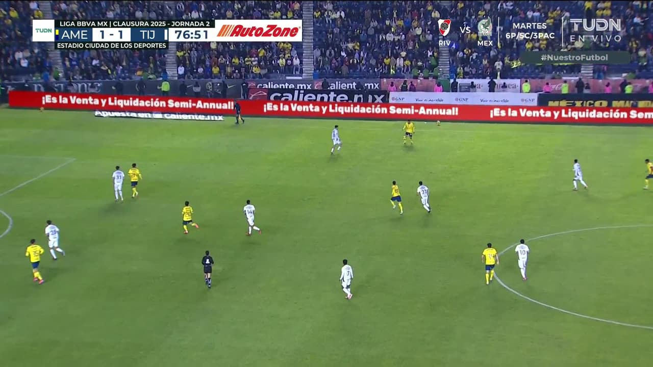 Tiro atajado. Esteban Lozano (América) Disparo con la derecha desde fuera del área.