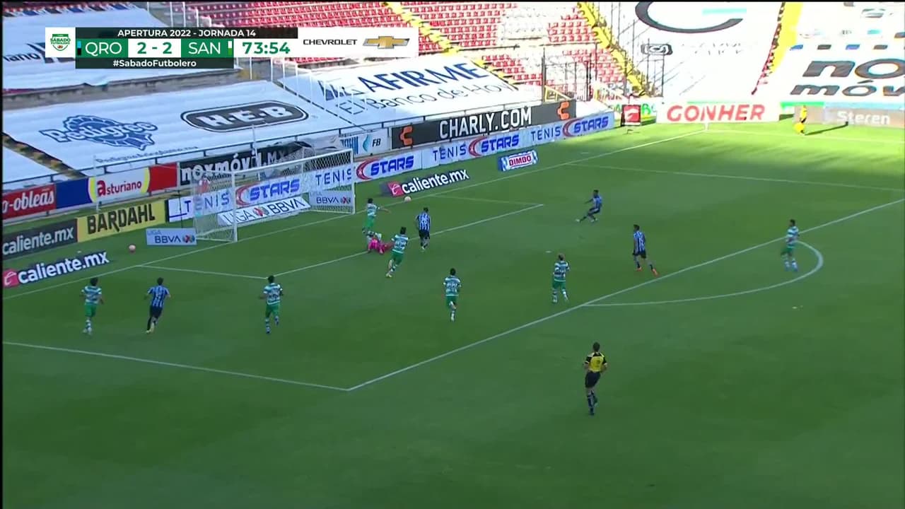 Tiro atajado. Ettson Ayón (Querétaro) Disparo con la derecha desde el centro del área.