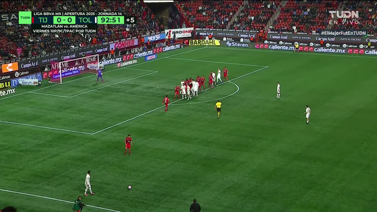 Tiro atajado. Everardo López (Toluca) zurdazo desde el centro del área.
