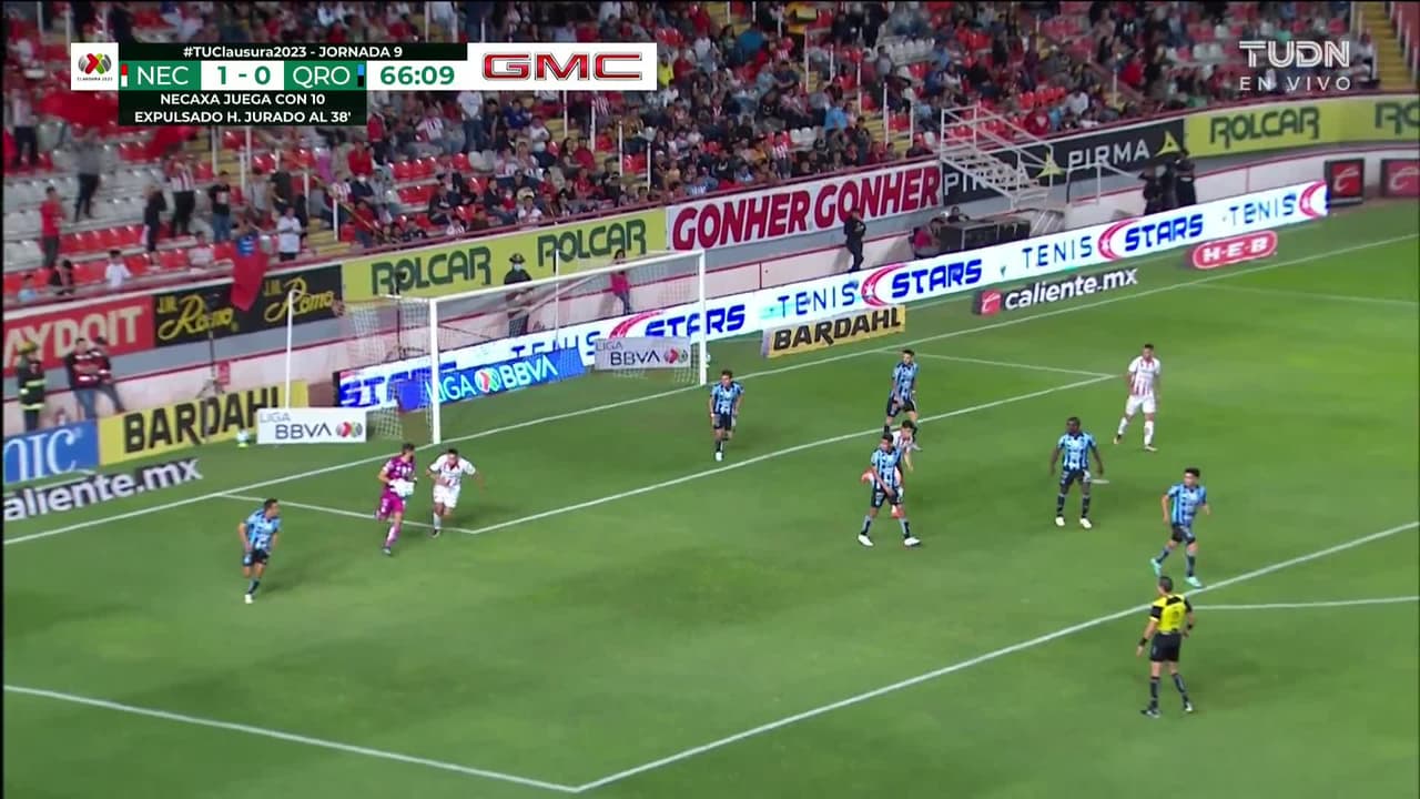 Tiro atajado Por arriba en el centro del arco. Fabricio Formiliano (Necaxa) disparo de cabeza desde el centro del área. Asistencia de Brayan Garnica con un centro al área.