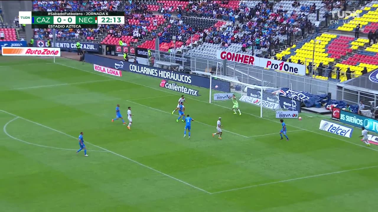 Tiro atajado. Facundo Batista (Necaxa) disparo de cabeza desde el centro del área.