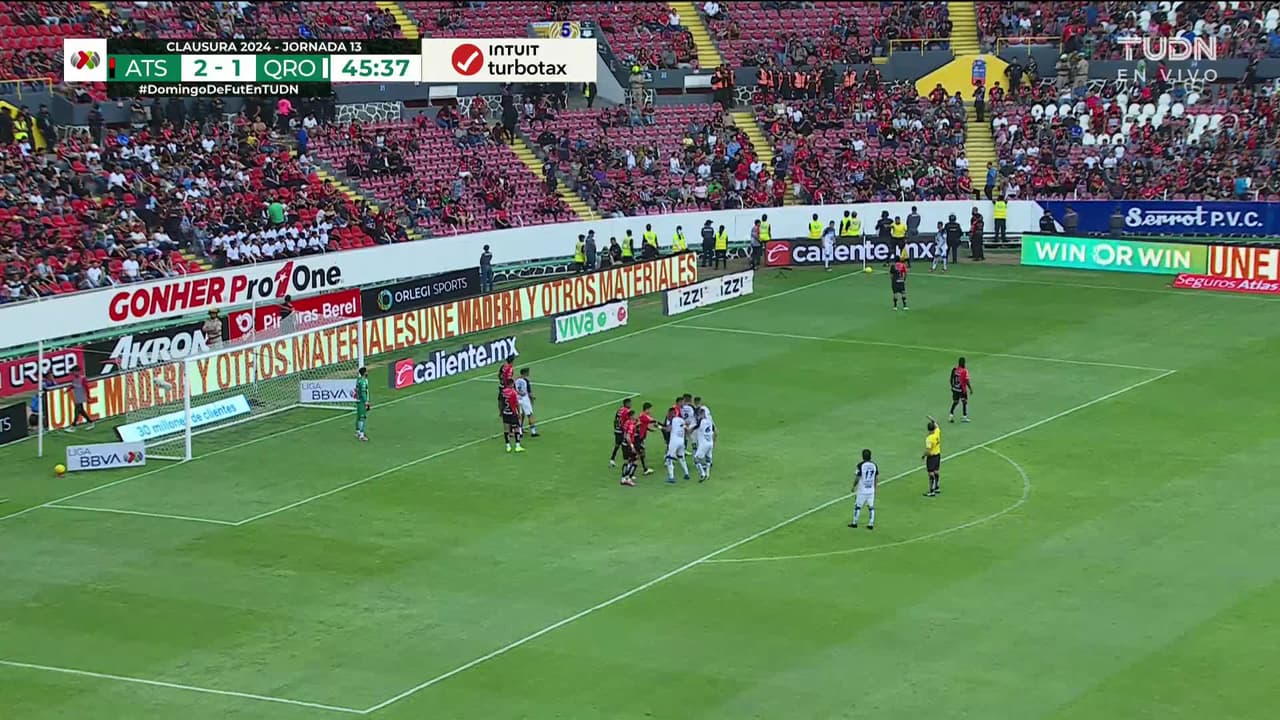 Tiro atajado Por arriba en el centro del arco. Facundo Batista (Querétaro) disparo de cabeza desde el centro del área. Asistencia de Francisco Venegas pase largo.