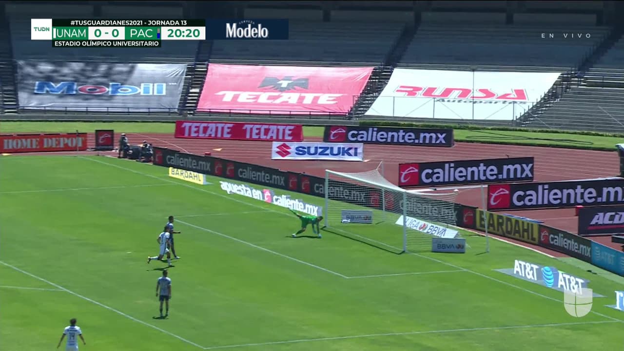 Tiro atajado Por arriba en el centro del arco. Facundo Waller (Pumas UNAM) zurdazo desde fuera del área. Asistencia de Juan Vigón.