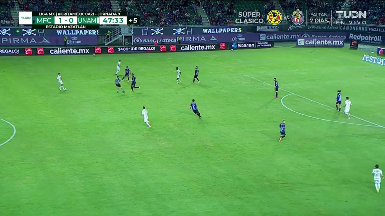 Remate parado rozando la escuadra izquierda. Favio Álvarez (Pumas UNAM) remate con la derecha desde fuera del área. Asistencia de Efraín Velarde.