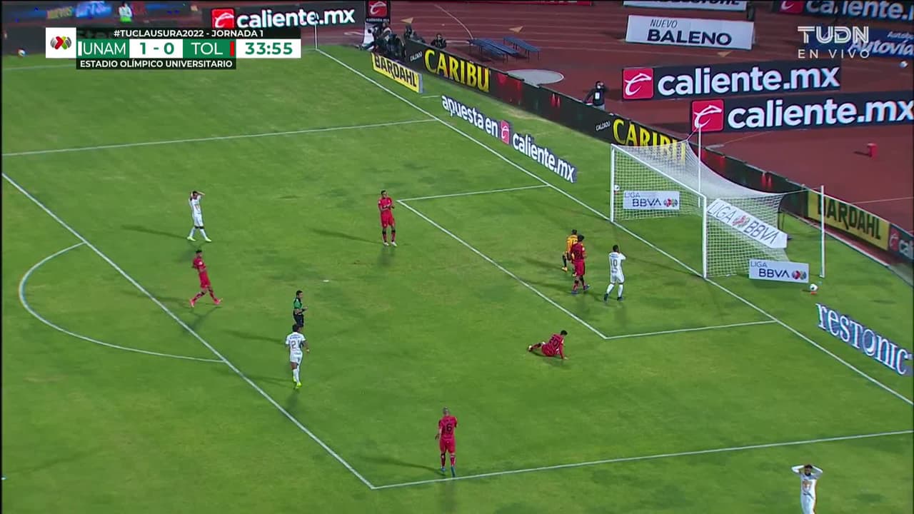 Tiro atajado. Favio Álvarez (Pumas UNAM) Disparo con la derecha desde el lado derecho dentro del área.