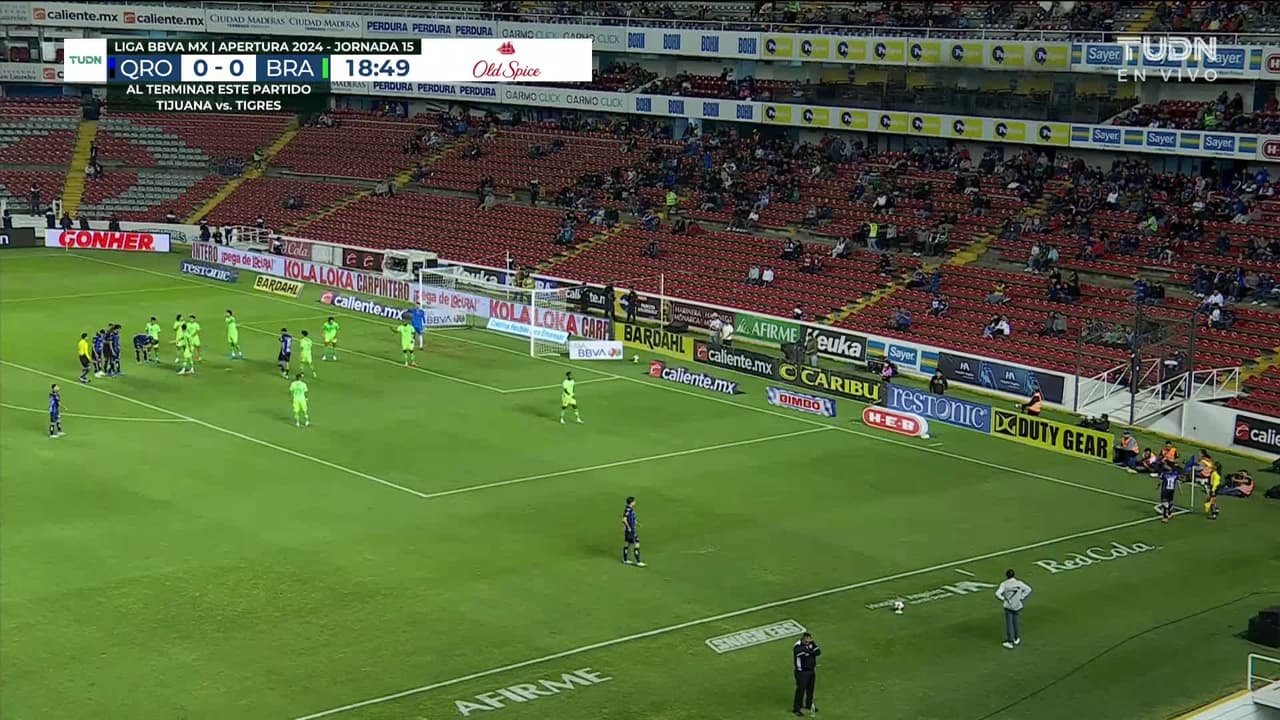 Tiro atajado Por arriba en el centro del arco. Federico Lértora (Querétaro) disparo de cabeza desde el centro del área. Asistencia de Lucas Rodríguez con un centro al área.