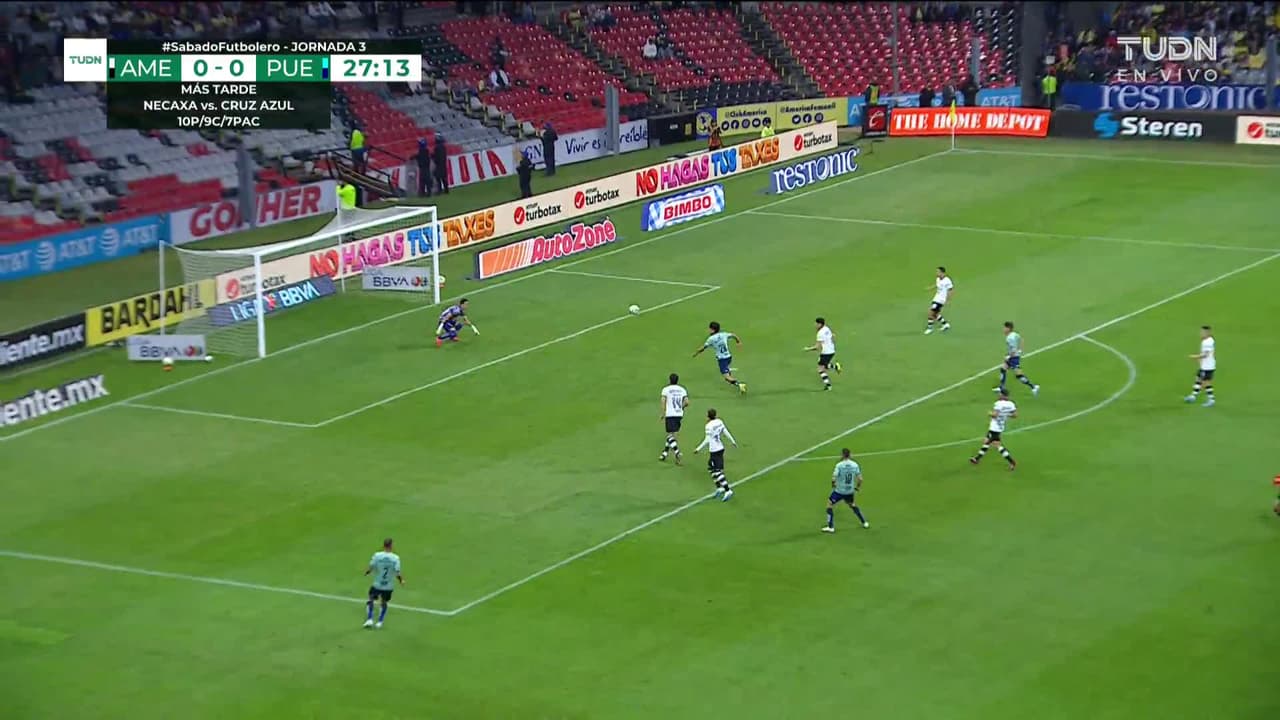 Tiro atajado raso al centro del arco. Federico Mancuello (Puebla) zurdazo desde fuera del área. Asistencia de Facundo Waller.