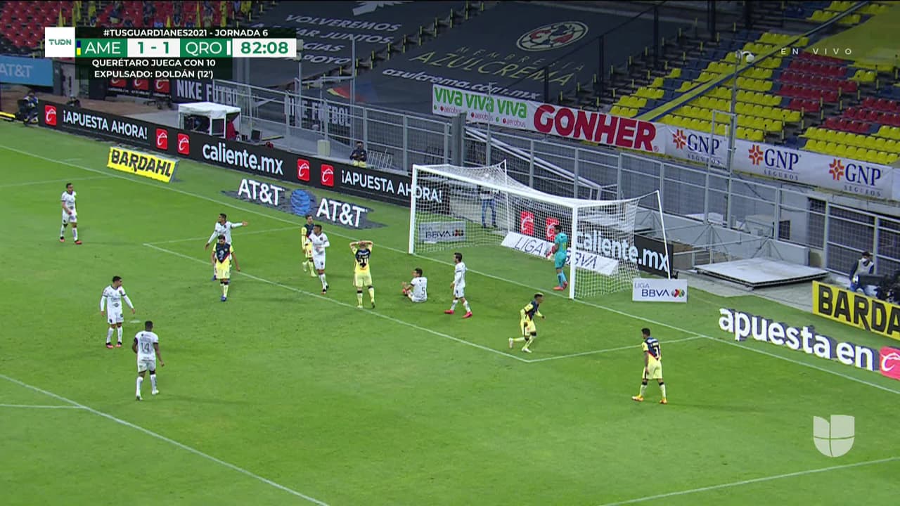 Tiro atajado al ángulo superior derecho. Federico Viñas (América) disparo de cabeza desde el centro del área. Asistencia de Mauro Laínez con un centro al área.