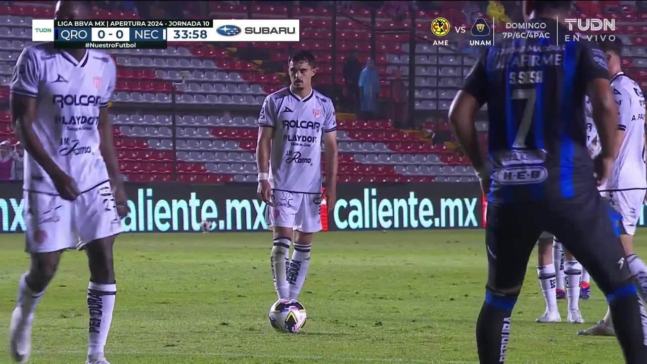 Tiro atajado raso al centro del arco. Fernando Arce (Necaxa) disparo de cabeza desde el centro del área. Asistencia de Heriberto Jurado con un centro al área.