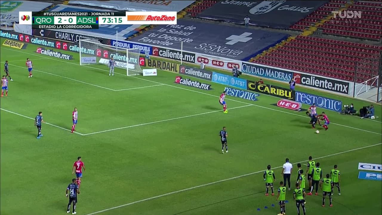 Tiro atajado. Fernando Madrigal (Querétaro) Disparo con la derecha desde el lado izquierdo dentro del área.
